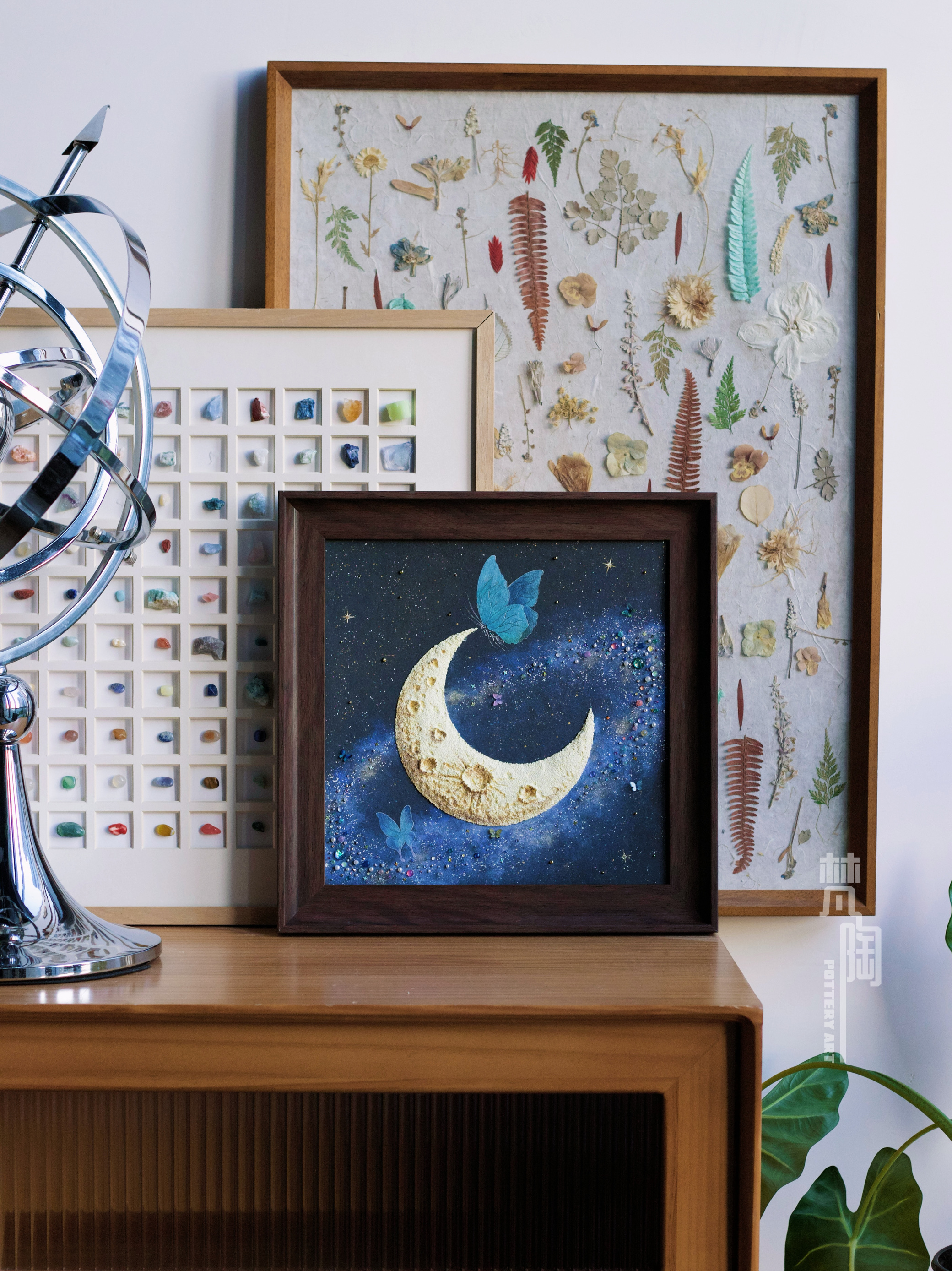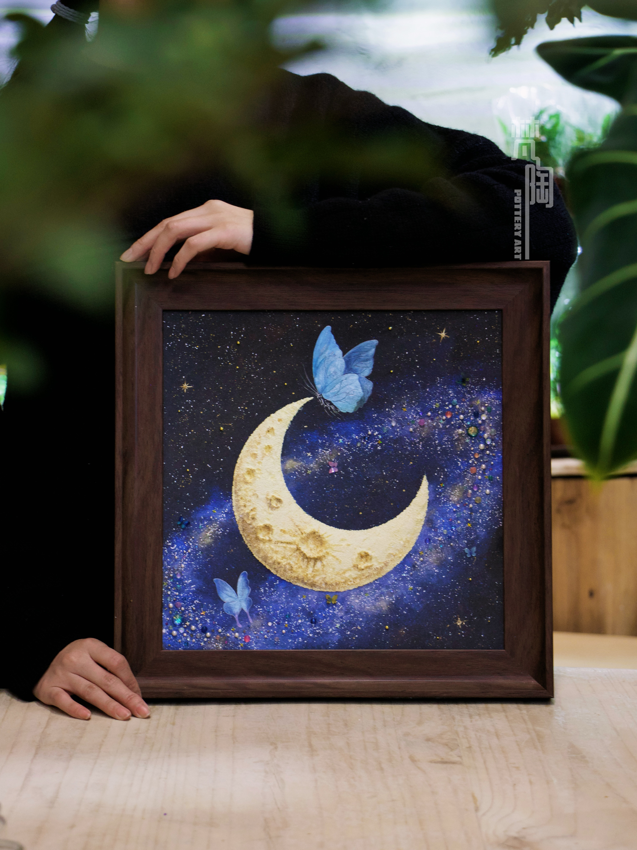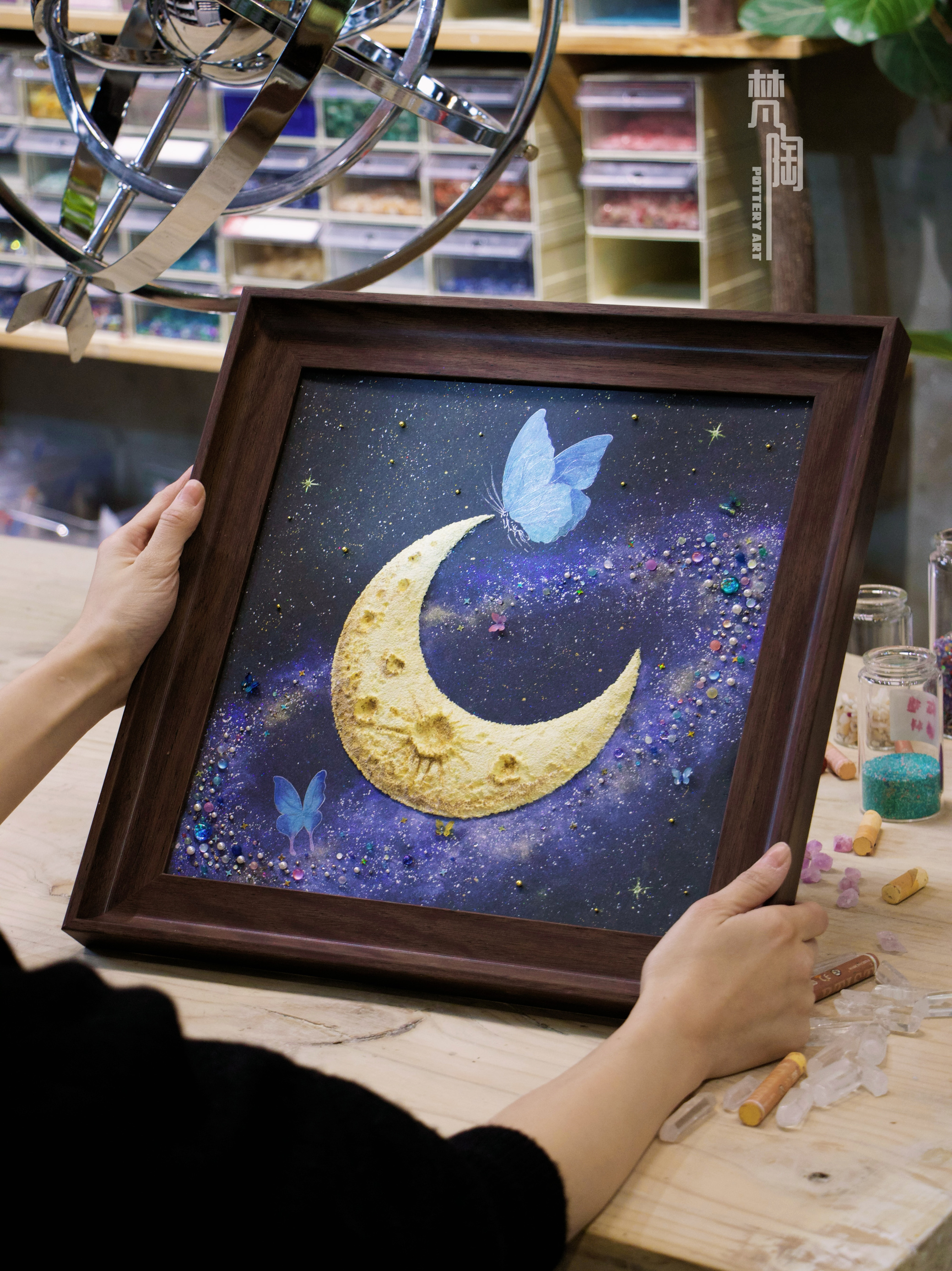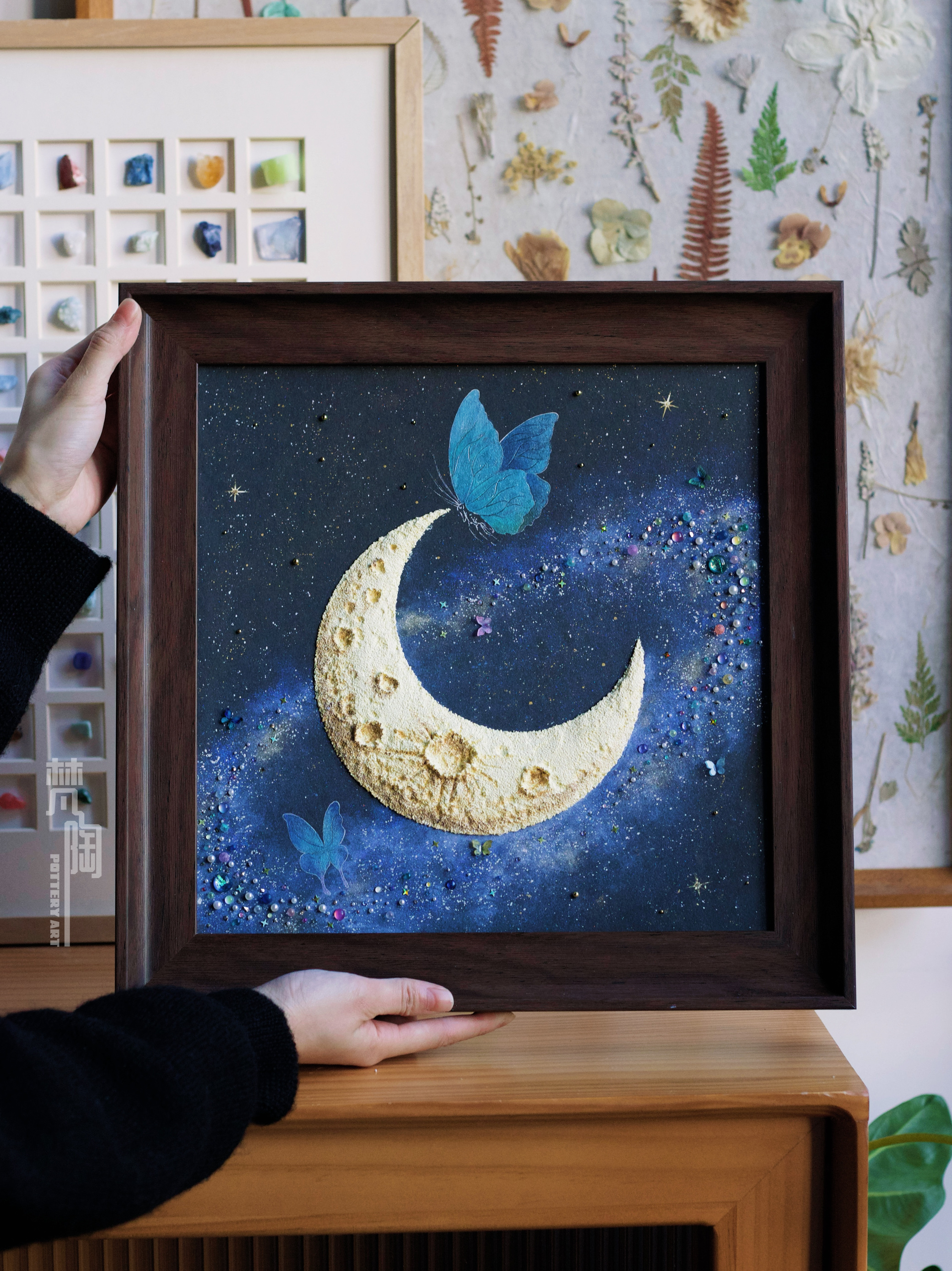 复古框蝴蝶标本装饰画蝴蝶标本礼物家居摆件月亮蝴蝶石英砂月球