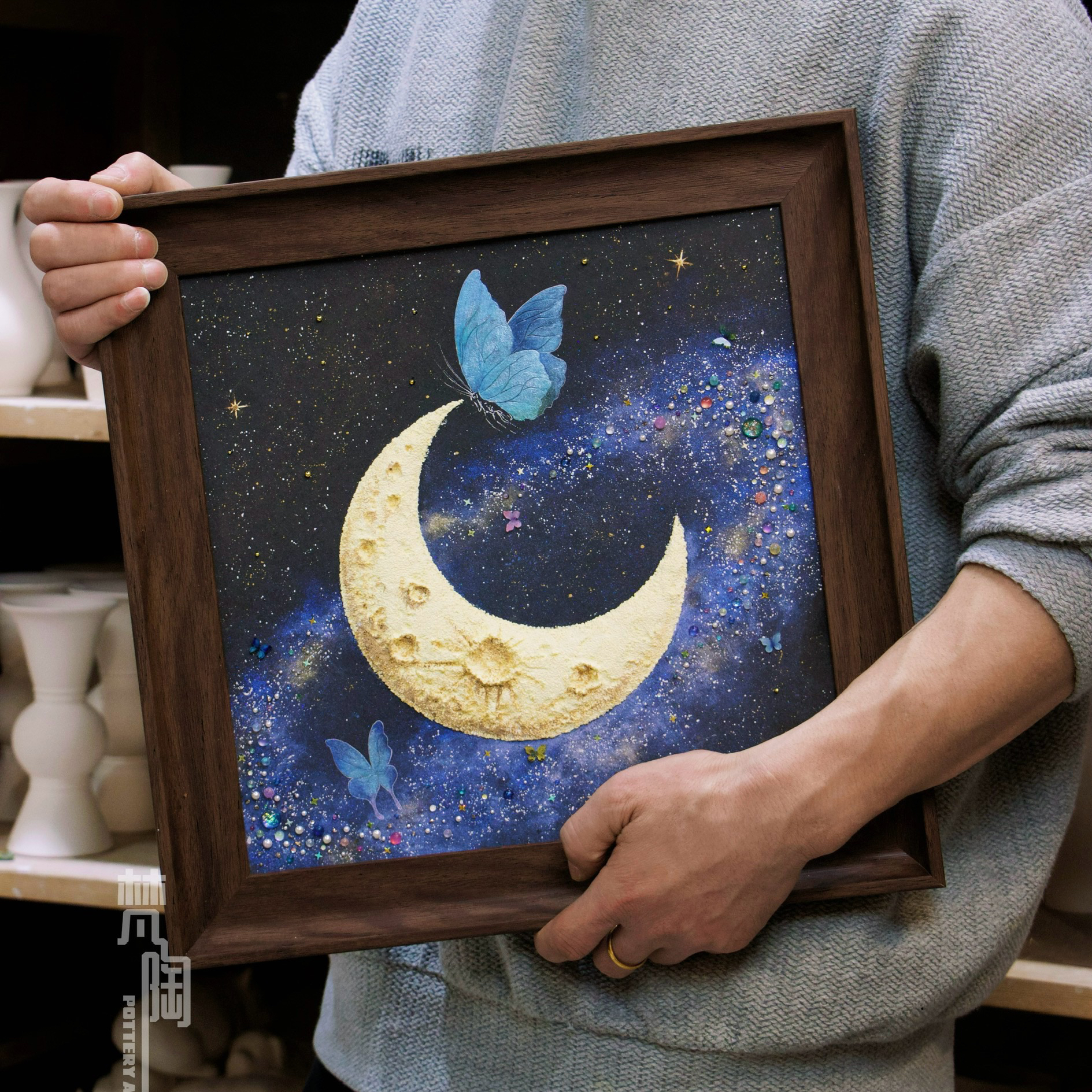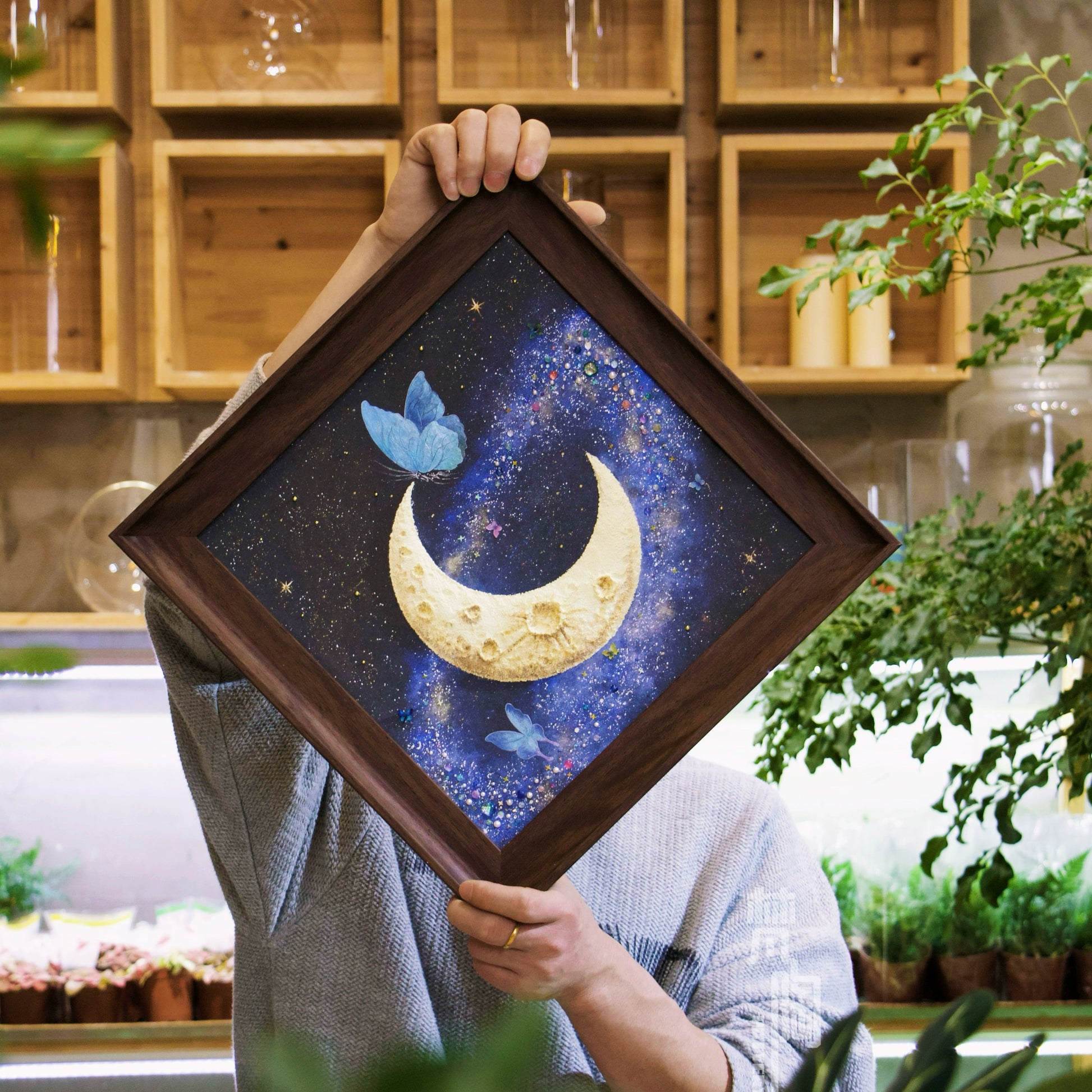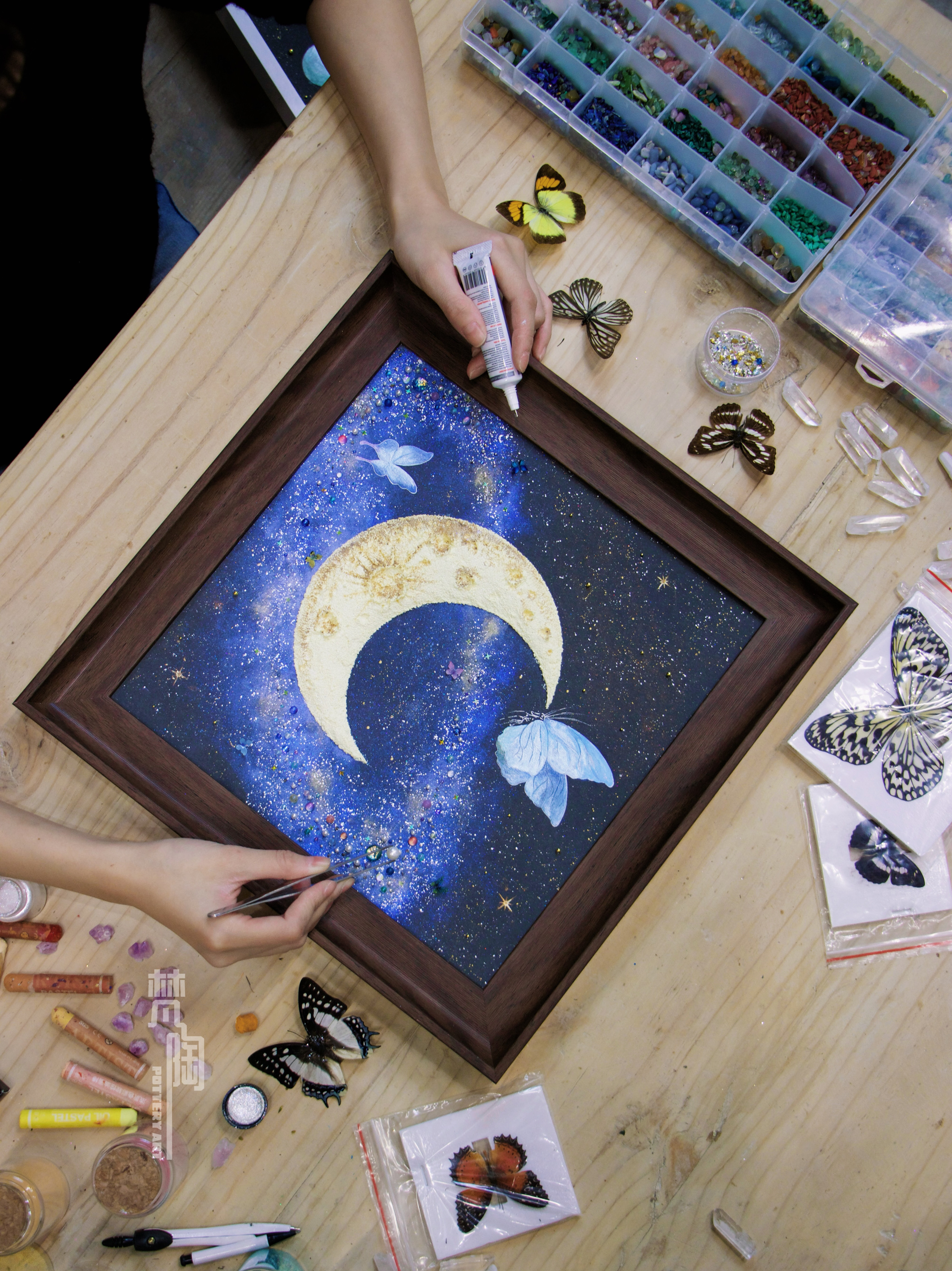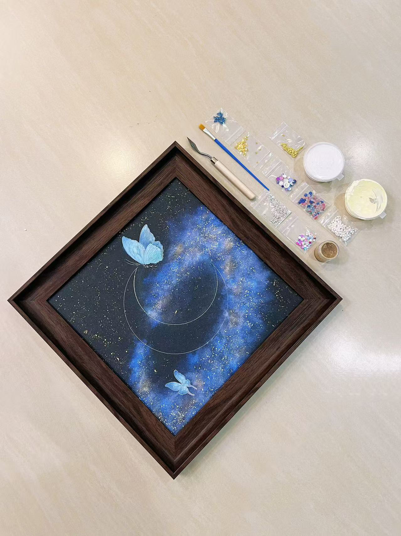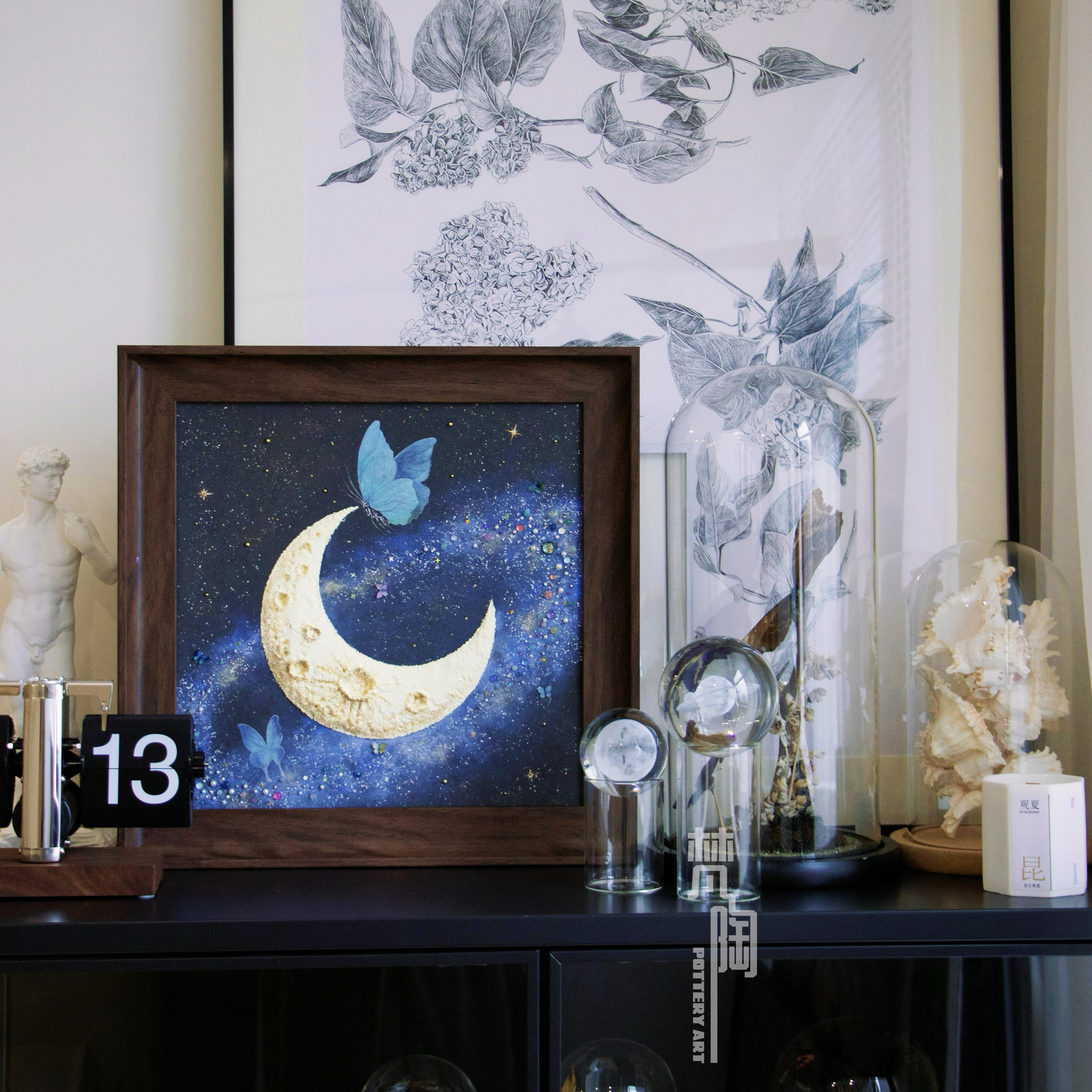 复古框蝴蝶标本装饰画蝴蝶标本礼物家居摆件月亮蝴蝶石英砂月球