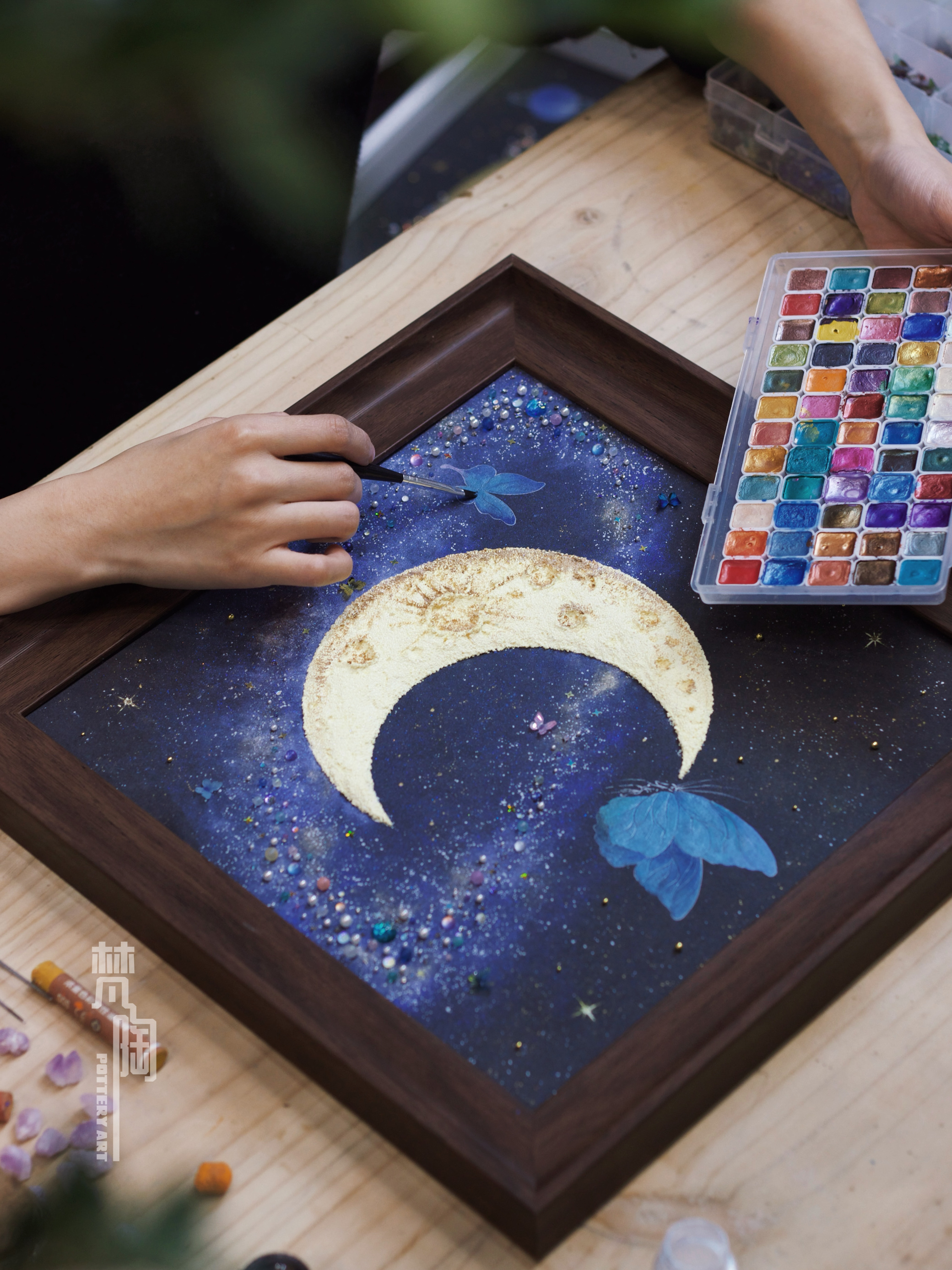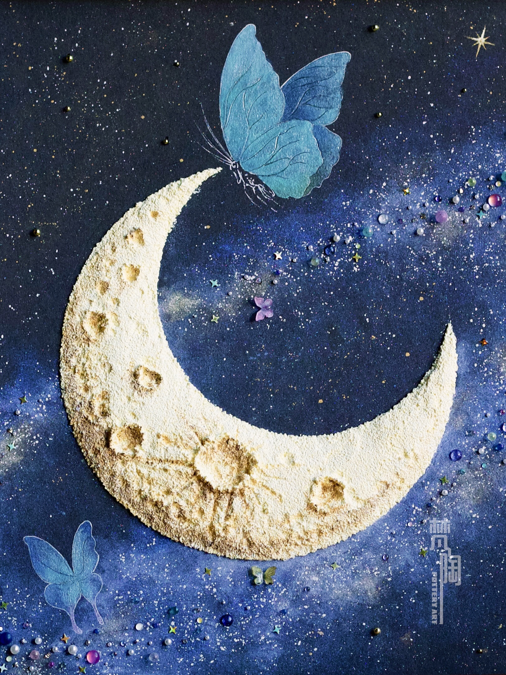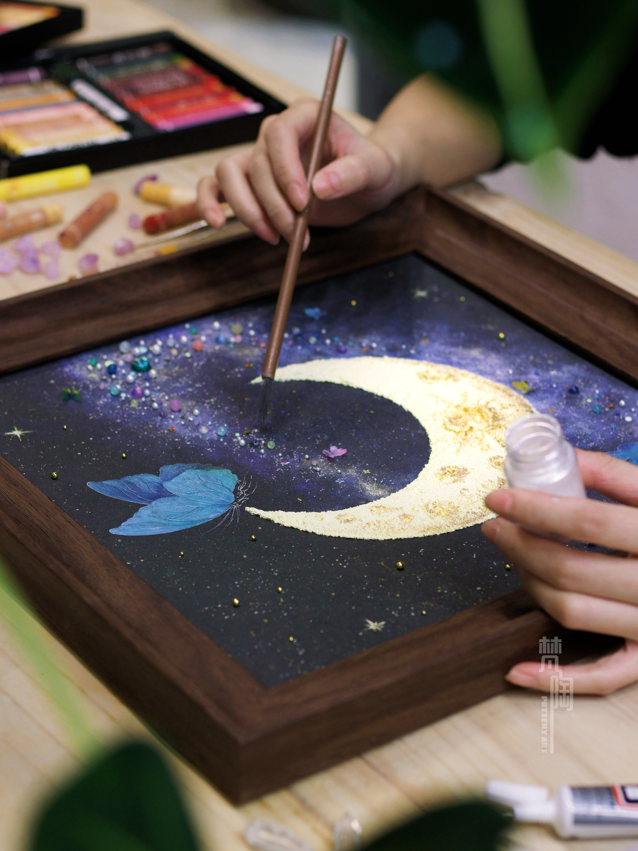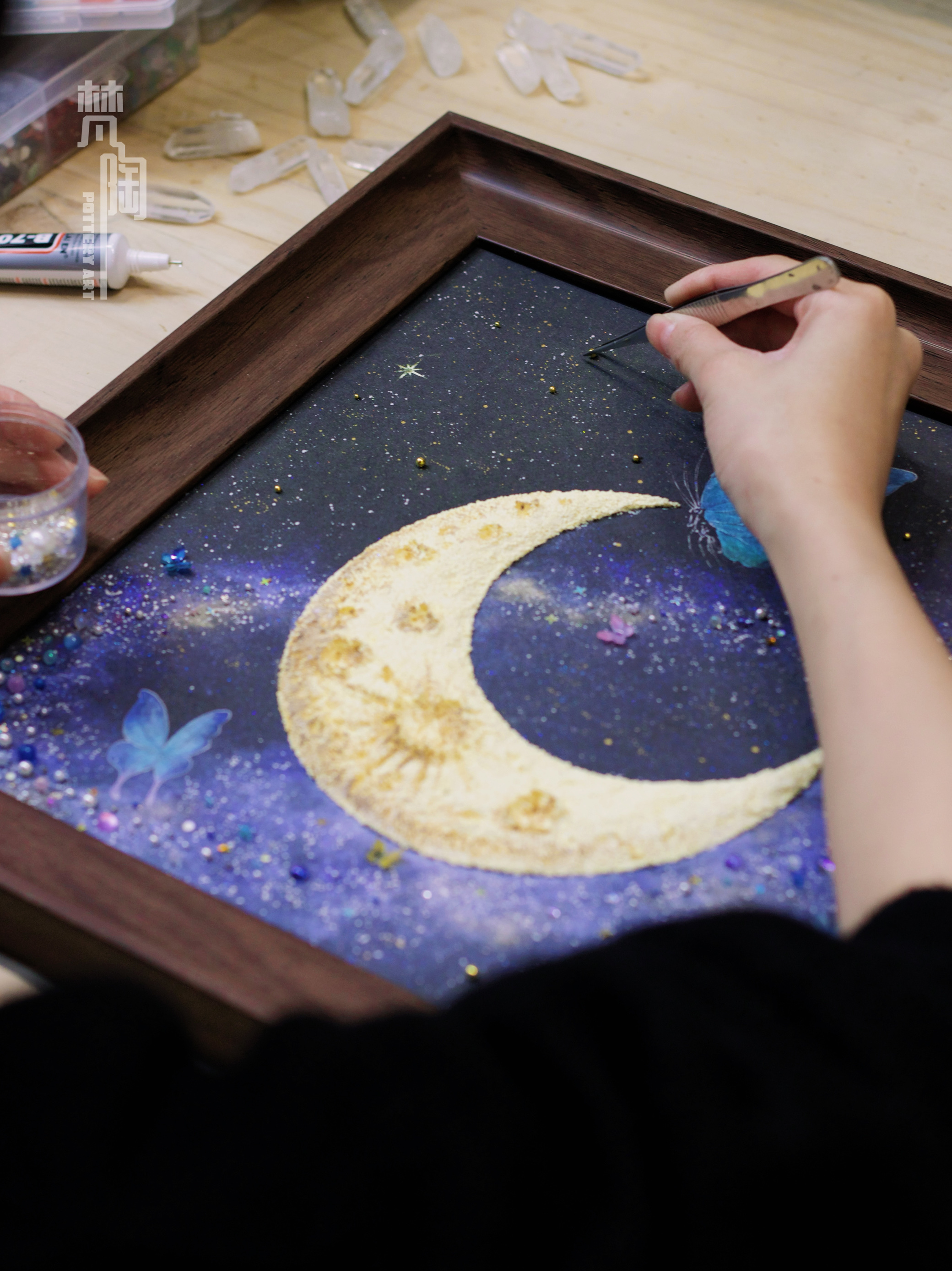 复古框蝴蝶标本装饰画蝴蝶标本礼物家居摆件月亮蝴蝶石英砂月球