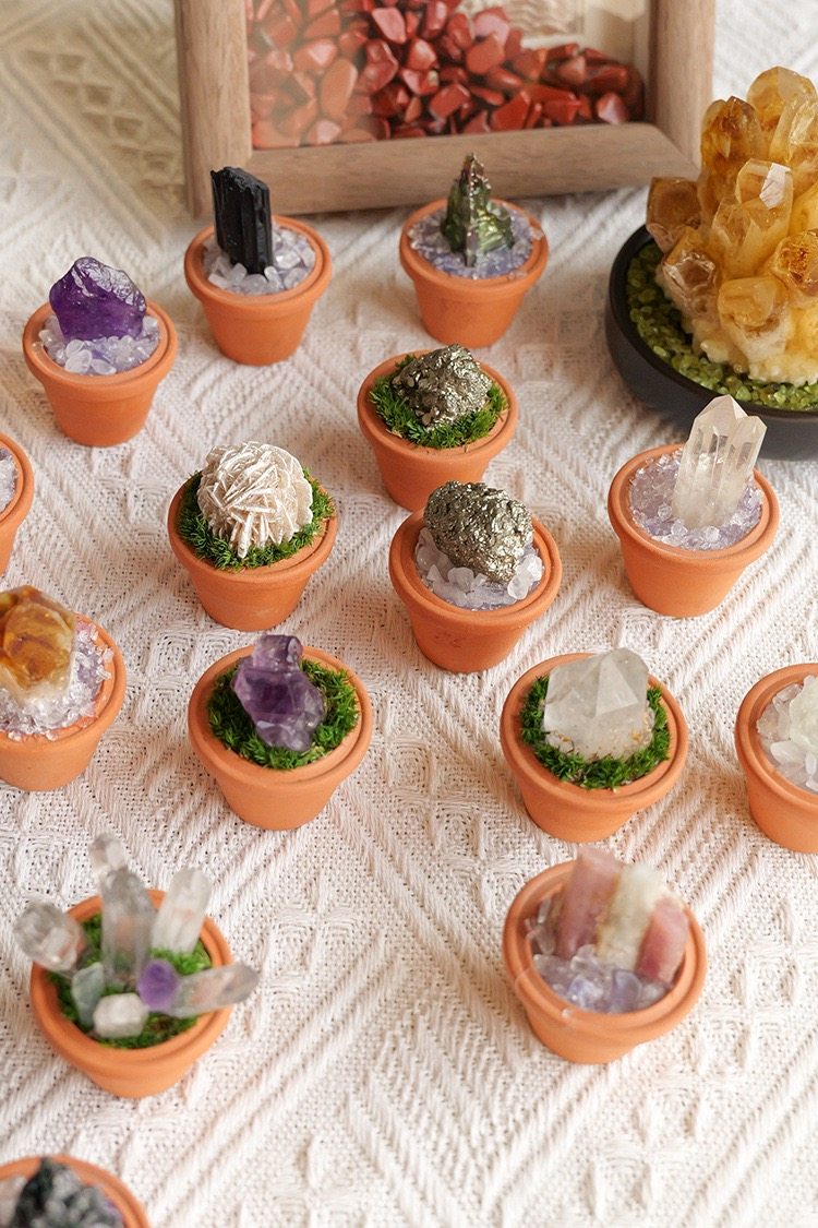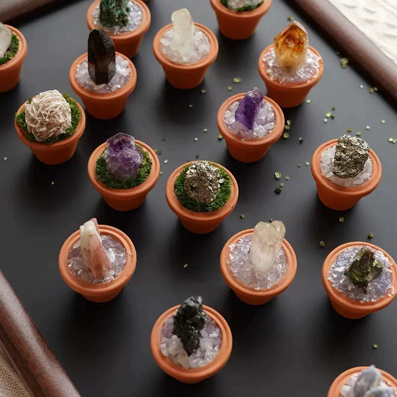 天然水晶原石陶盆摆件水晶diy仿真盆栽家居办公桌面车载摆件