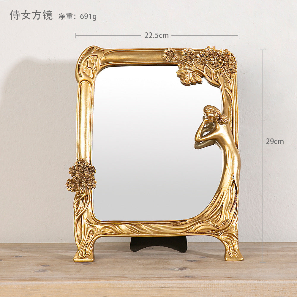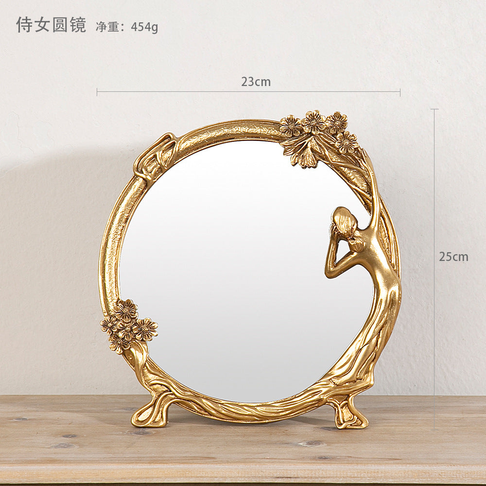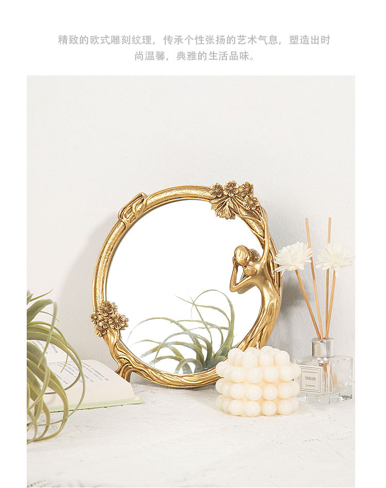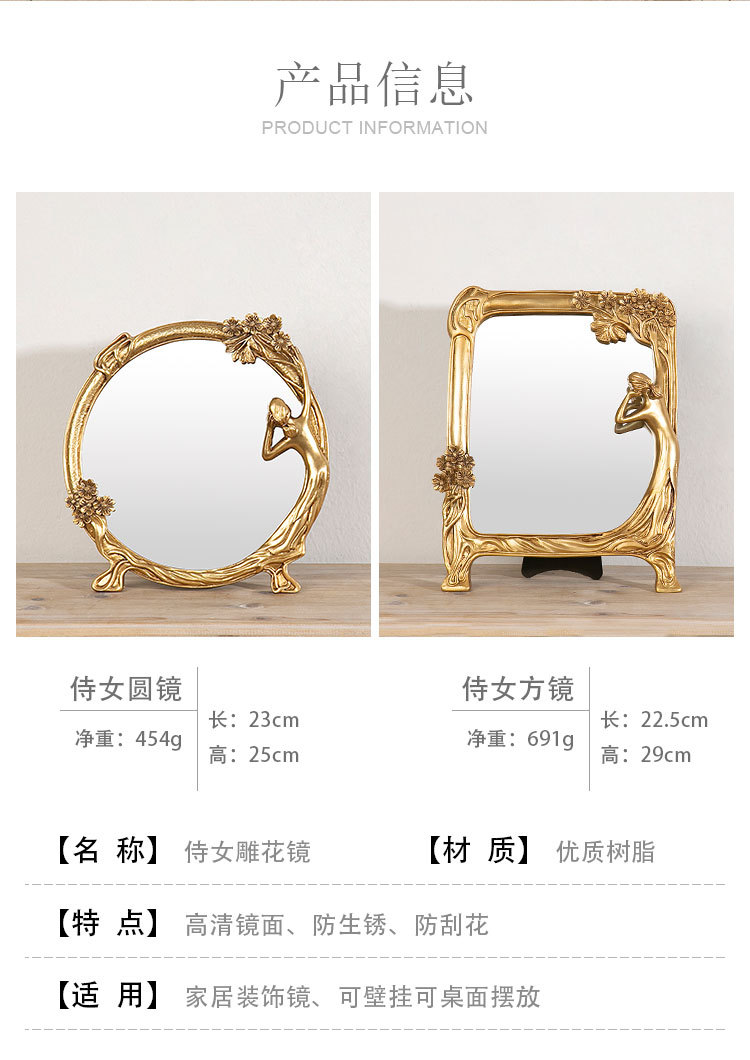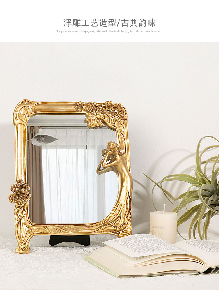 欧式轻奢树脂浮雕金色侍女镜化妆镜复古树脂拍照道具少女梳妆镜子