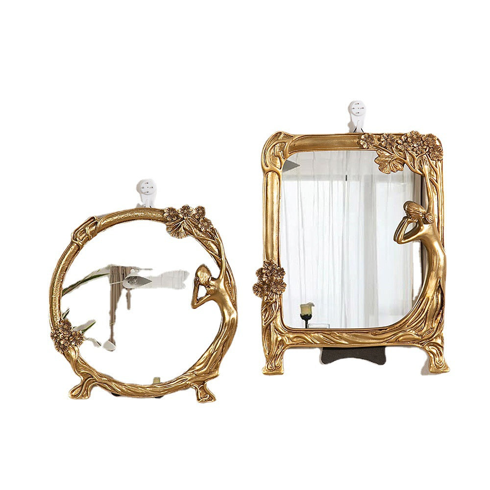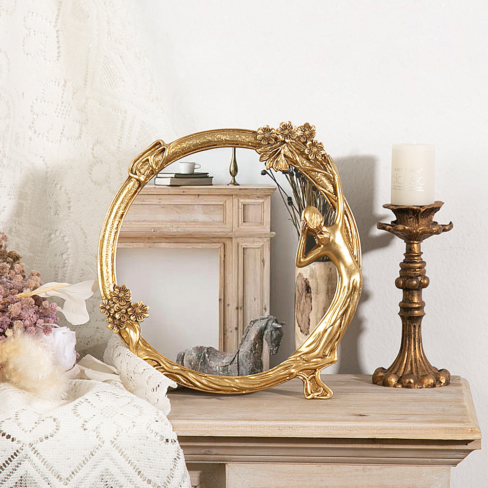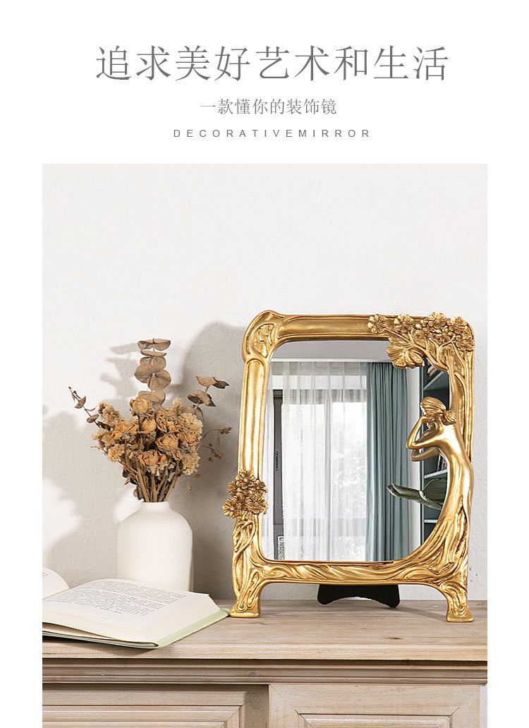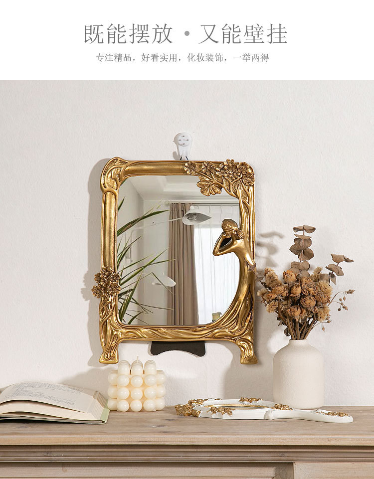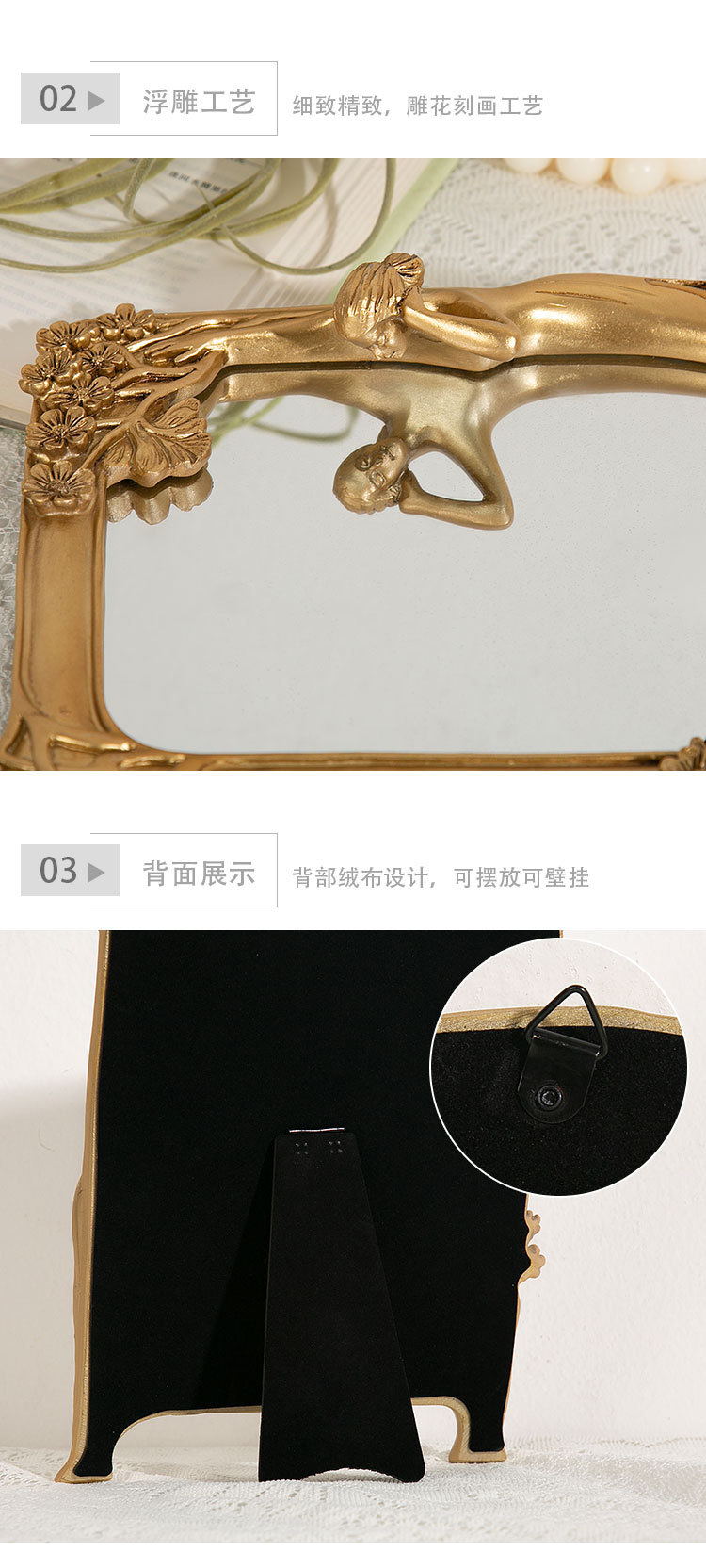 欧式轻奢树脂浮雕金色侍女镜化妆镜复古树脂拍照道具少女梳妆镜子