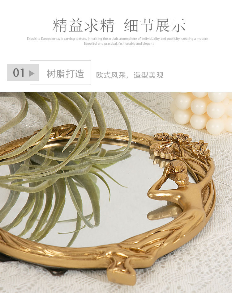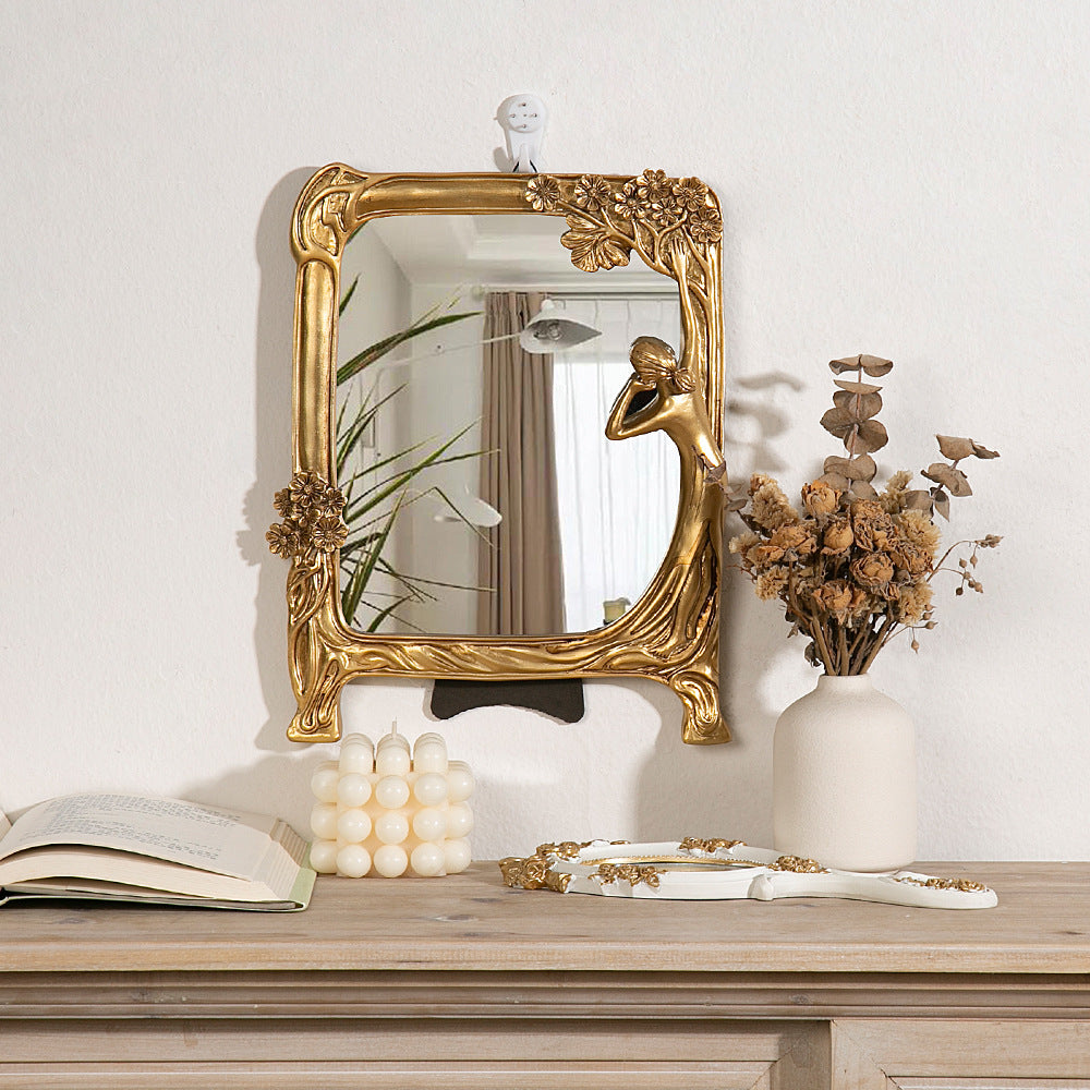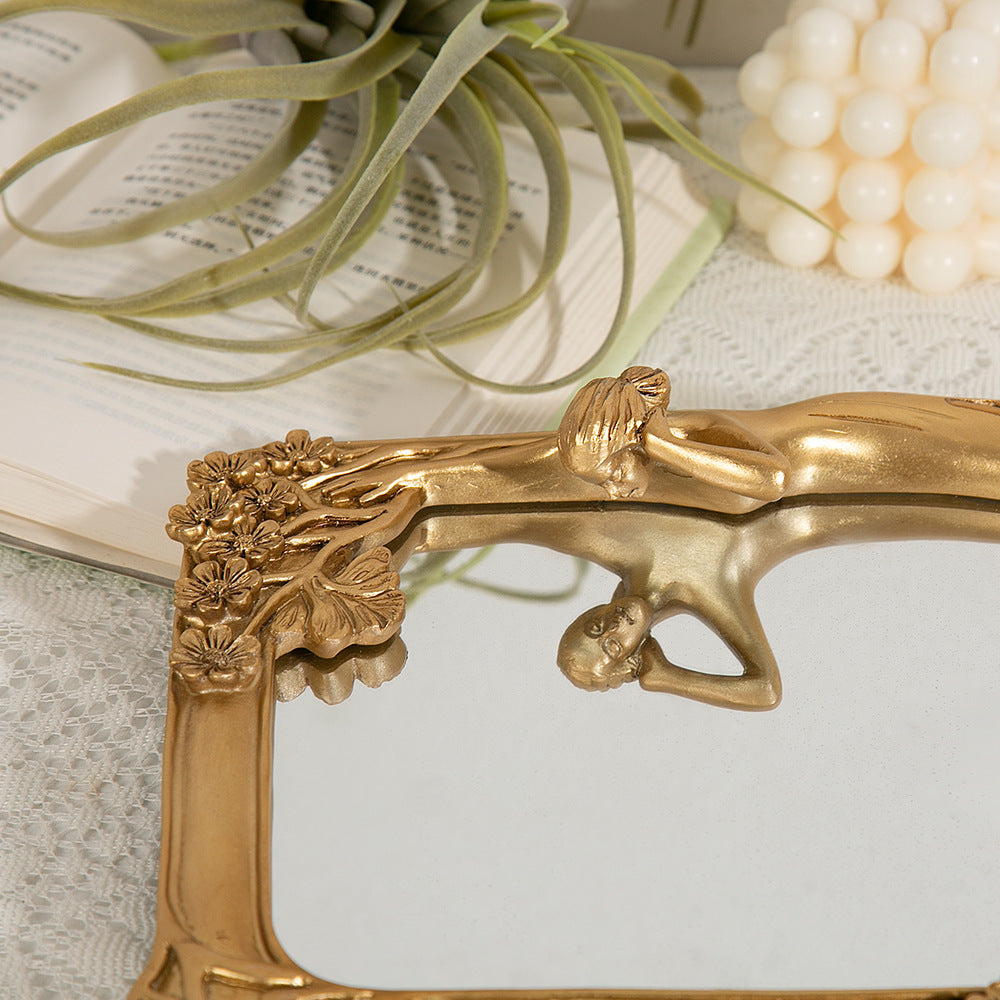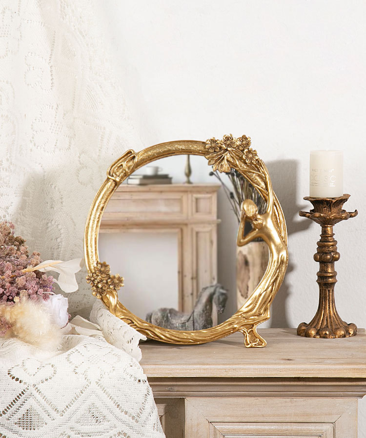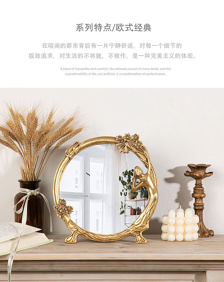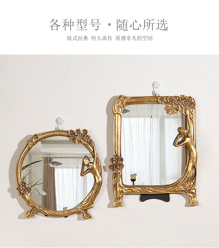 欧式轻奢树脂浮雕金色侍女镜化妆镜复古树脂拍照道具少女梳妆镜子