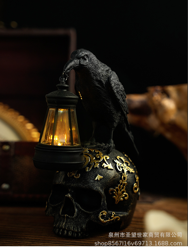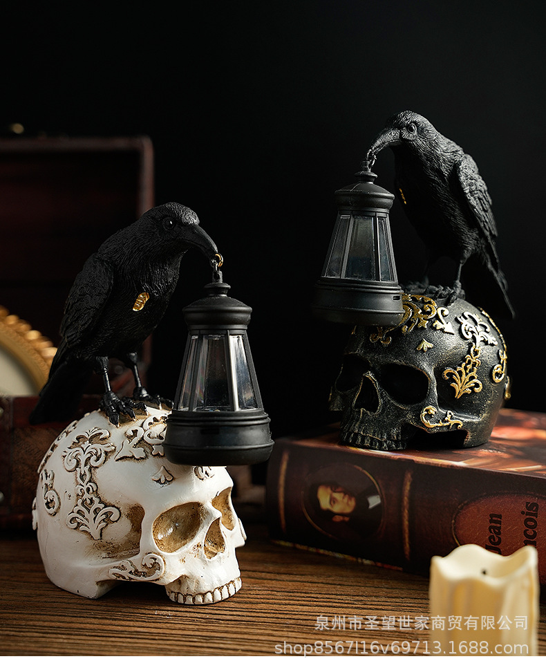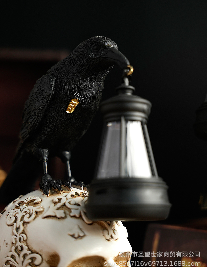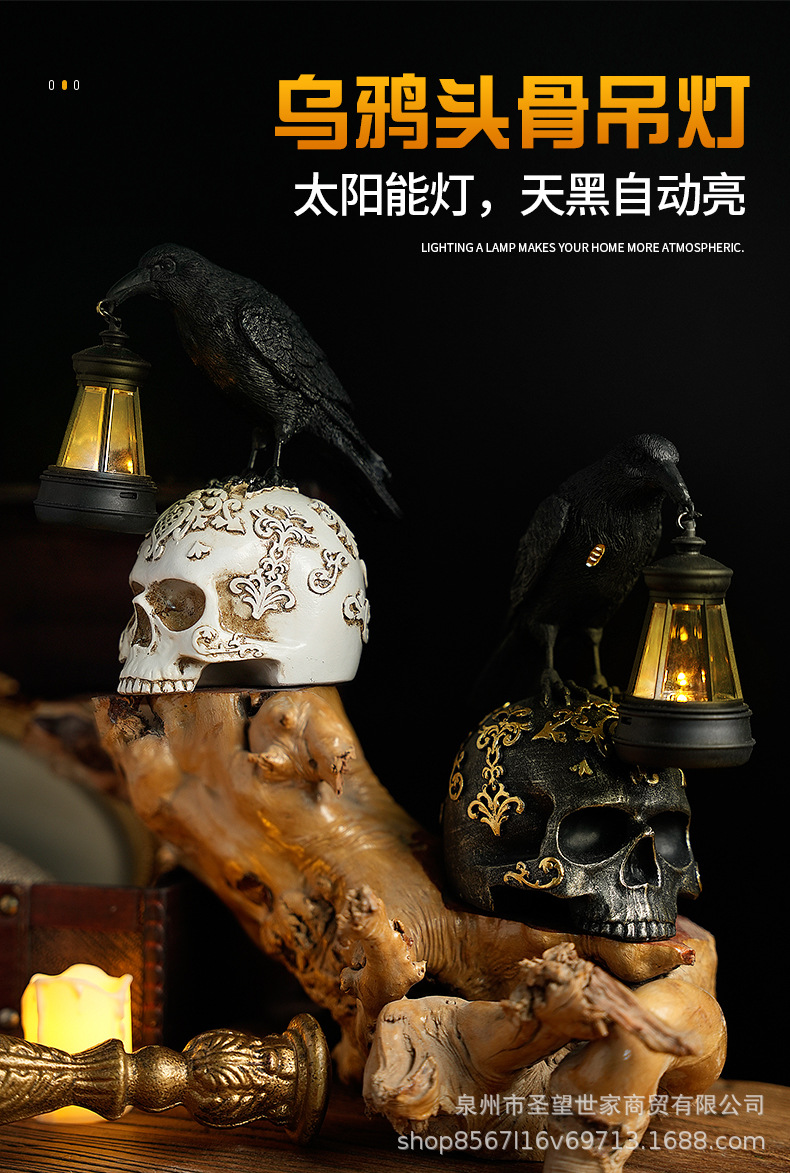 跨境新品万圣节乌鸦摆件复古桌面骷髅道具树脂摆件太阳能鬼节装饰
